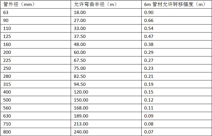 我们在管道铺设时,由于沟槽、地形的因素,有时会出现小型障碍物,必须借助管材的弯曲和接头的角度进行转弯,一般来讲,借助管材转弯的曲率半径不得小于管材直径的300倍,必要时还应设水泥镇墩加以固定;借助接头转弯每个接头转弯角度不宜大于1°。下面是各种管材的曲率半径及幅度表,仅供参考: