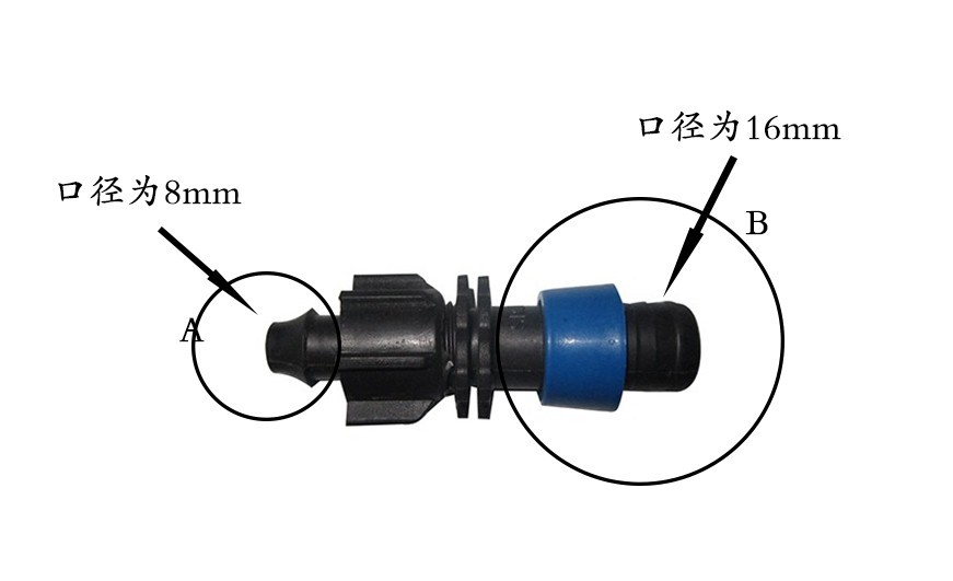 3.将滴灌带一端用剪刀剪平整,套在管件 B 端,要保证滴灌带要在蓝色拉环以内。